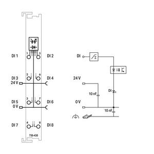 Das Digitaleingangsmodul verfügt bei nur 12 mm Baubreite über 8 Kanäle. Es erfasst Steuersignale aus dem Feldbereich, z.B. über Sensoren.