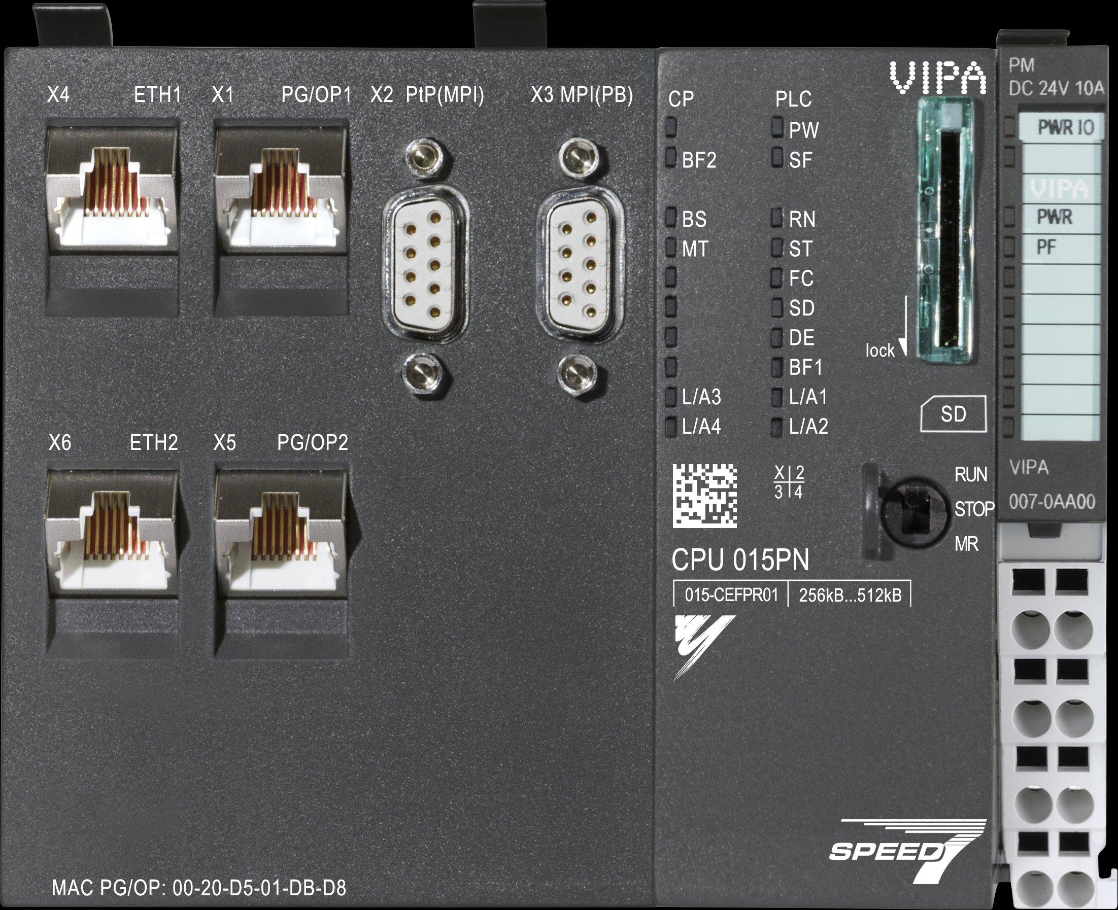 CPU 015PN - SPEED7 TechnologieSpannungsversorgung: DC 24VArbeitsspeicher integriert: 256kByte (50% Programm / 50% Daten)Arbeitsspeicher erweiterbar bis: 512kByte (50% Programm / 50% Daten)Interface 1: RJ45-Switch: Aktive Ethernet & PG/OP-KommunikationInterface 2: RS485 (potenzialgetrennt): MPI, USS-Master, ASCII, ETX/STX, 3964R, Modbus-Master /-Slave (umschaltbar)Interface 3: RS485 (potenzialgetrennt): MPI (optional PROFIBUS-SLAVE oder PROFIBUS-MASTER)Interface 4: RJ45-Switch: PROFINET-Controller für bis zu 128 TeilnehmerInterface 5: RJ45-Switch: Aktive Ethernet & PG/OP-KommunikationInterface 6: RJ45-Switch: PROFINET-Controller für bis zu 128 TeilnehmerSD-Karten-Slot mit Verriegelung, bis zu 64 SLIO Module anreihbar, programmierbar über SPEED7 Studio, SIMATIC Manager und TIA Portal