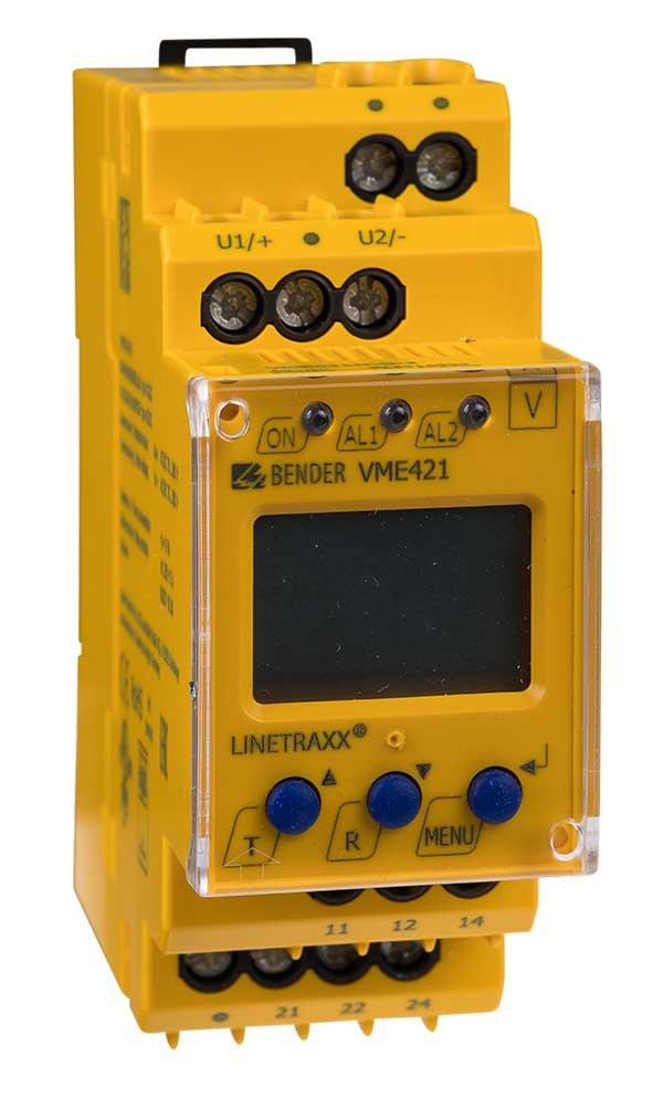 Die Spannungsrelais der Serie VME421H überwachen Frequenz, Unterspannungen, Über­spannungen und die Spannung zwischen zwei Schwellwerten (Fensterfunktion) in AC- und DC-Systemen. Die Spannungen werden als Effektivwerte gemessen. Der aktuelle Messwert wird permanent auf dem LC-Display angezeigt. Der zum Schalten der Alarmrelais führende Messwert wird gespeichert. Durch einstellbare Verzögerungszeiten können anlagenspezifische Eigenschaften berücksichtigt werden z. B. gerätebedingte Anlaufphasen, kurzzeitige Spannungsänderungen usw. Die Ausführung VME421H entnimmt die Versorgungs­spannung dem zu überwachenden System und hat einen internen Energiespeicher.