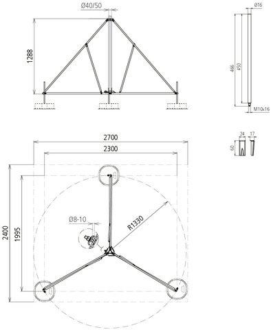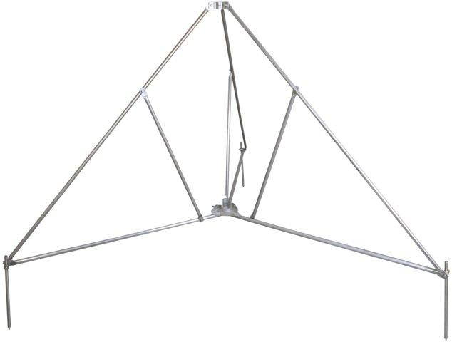 Dreibeinstativ (Ausführung klappbar) für Stützrohre D 50 mm mit seitlichem Auslass oder Fangstange D 40 mm mit Reduzierungszubehör. Mit Doppelüberleger für den Anschluss 2x Rd 8-10 mm, zum Errichten mit Betonsockel (Gewicht 17 kg) mit Anpassung mittels Sockelhalterset an die Dachneigung bis max. 10°.