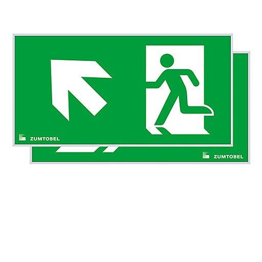 Sicherheitszeichen für PURESIGN 150 P MSC-WF/MRC-WF/MRCR-WF mit Aluminiumrahmen silber (RAL 7035 ähnlich), pulverbeschichtet, zur einfachen Montage auf die PURESIGN/COMSIGN 150 P Gehäuse für Seilabhängung, max. Seilabhängung: 1,5 m, gleichmäßige Hinterleuchtung des Piktogramms, Leuchtdichte > 500 cd/m² im weißen Bereich, Piktogramm per Digitaldruck auf die PC (Polycarbonat)- Scheibe aufgebracht, Sicherheitszeichen gemäß ISO 7010: 2seitig, Symbol: Rettungsweg/Notausgang. Richtungspfeil zur Seite nach oben, Erkennungsweite gemäß EN 1838: 30 m, Abmessung: 310 x 20 x 160 mm, Gewicht: 0,72 kg