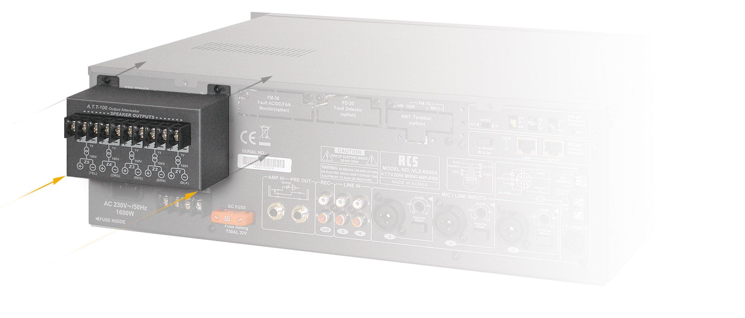 Der ATT-100 wird an der Rückseite einer 100V-Zentrale (z.B. VLA-240C oder VLZ-6600A) angeschlossen. Er kann direkt an die Rückwand der Kleinzentrale montiert werden. Das 100V-Signal des Verstärkers wird durch den ATT-100 in ein LINE-Signal umgewandelt. Dadurch wird erreicht, dass eine Kaskadierbarkeit für die Ausgangslinien 1 bis 5 besteht.