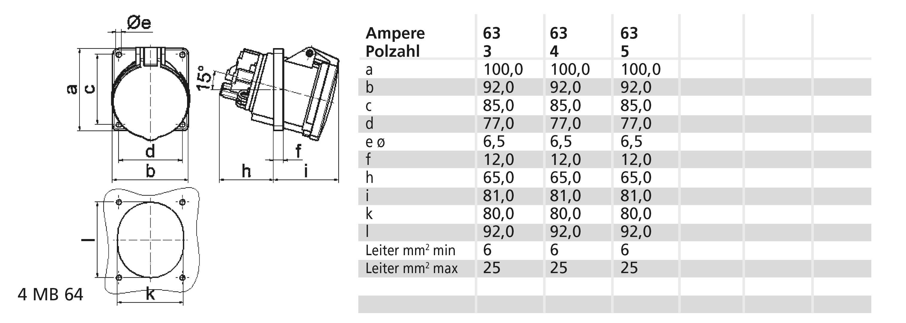 120306/CEE-Anbausteckdose 63A400V6h5pIP44, Anbausteckdose Quick-Connect TE geneigt 63A 5p 400V 6h, IP44
