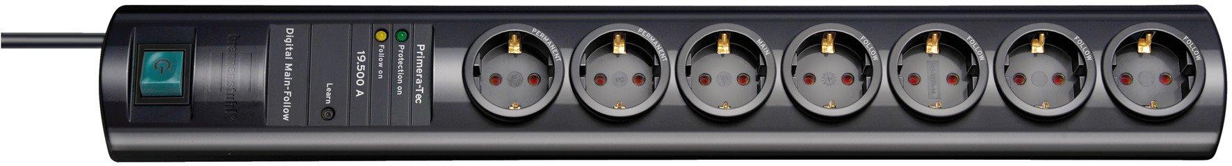 Primera-Tec 19.500A Überspannungsschutz-Steckdosenleiste 7-fach schwarz 2m H05VV-F 3G1,5 2 permanent, 5 schaltbarWird das in der Main-Steckdose angeschlossene Gerät eingeschaltet, werden die Follow-Steckdosen mit eingeschaltet. Fließt kein Strom über die Main-Steckdose, werden Follow-Steckdosen ausgeschalten.* Schützt wertvolle Geräte vor Überspannungen mit einem max. Ableitstrom bis zu 19.500 A.* Optische Funktionsanzeige für Überspannungsschutz.* Mit dem Ein/Aus Schalter des Gerätes, welches in der Main-Steckdose eingesteckt ist, können alle Geräte in den Follow-Steckdosen automatisch mit ein- und ausgeschaltet werden.* 2 Permanent-, 1 Main- und 4 Follow-Steckdosen (alternativ 7 Permanent-Steckdosen).* Digital: Speichert auf Knopfdruck die richtige Einstellung für Ihr Main-Gerät.* Fortschrittlich: Schaltet Ihre Follow-Geräte sicher und schonend durch modernste Technik.* Flexibel: Lässt sich bei Bedarf in einen Permanent-Modus umschalten.* Formschönes und stabiles Gehäuse durch poliertes, hochbruchfestes Polycarbonat.* Kabelausgang variabel auf beiden Seiten möglich.* Sicherheitsschalter beleuchtet, zweipolig ein-/ausschaltbar.* Steckdosen in 90°-Anordnung.* Steckdosen mit erhöhtem Berührungsschutz.* Mit Befestigungsösen zur Wandmontage.