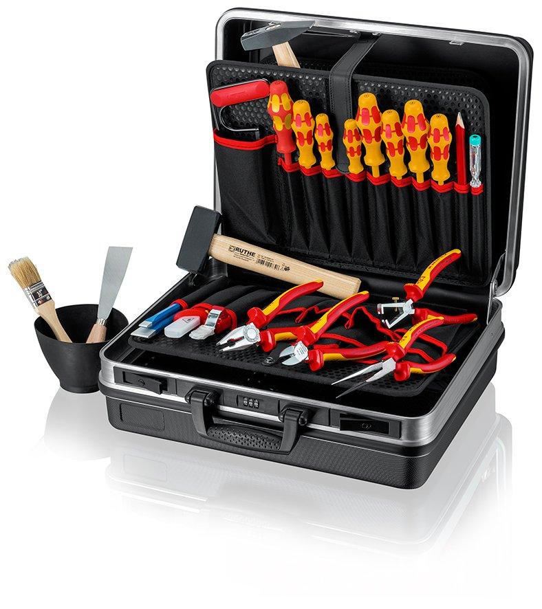 Bestückt mit 24 Markenwerkzeugen teilweise VDE-geprüft nach DIN EN/IEC 60900, KNIPEX-Werkzeugkoffer aus robustem Kunststoff (ABS); umlaufender Aluminiumrahmen; Dokumentenfach im Deckel; ergonomischer Tragegriff; zwei Metall-Kippschlösser und dreistelliges Zahlencodeschloss zum sicheren Verschließen des Deckels; zwei herausnehmbare Werkzeugtafeln aus schmutzabweisenden PP-Hohlkammerplatten; Max. Zuladung: 15 kg, Maße B x H x T (innen): 440 x 350 x 180 mm, Maße B x H x T (außen): 465 x 410 x 200 mm